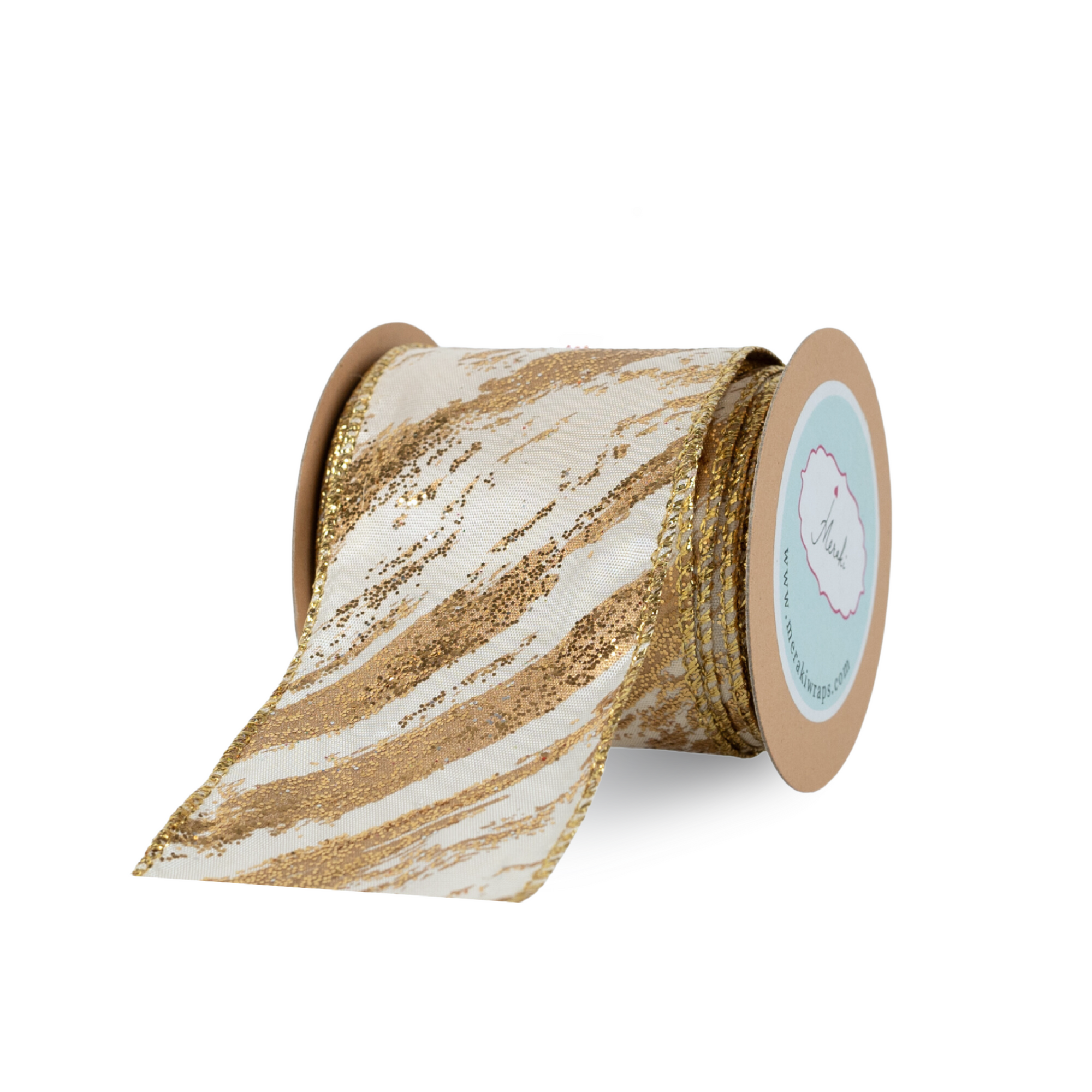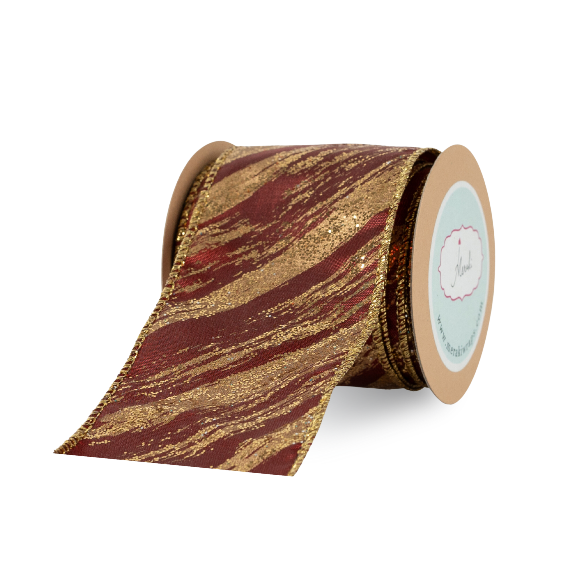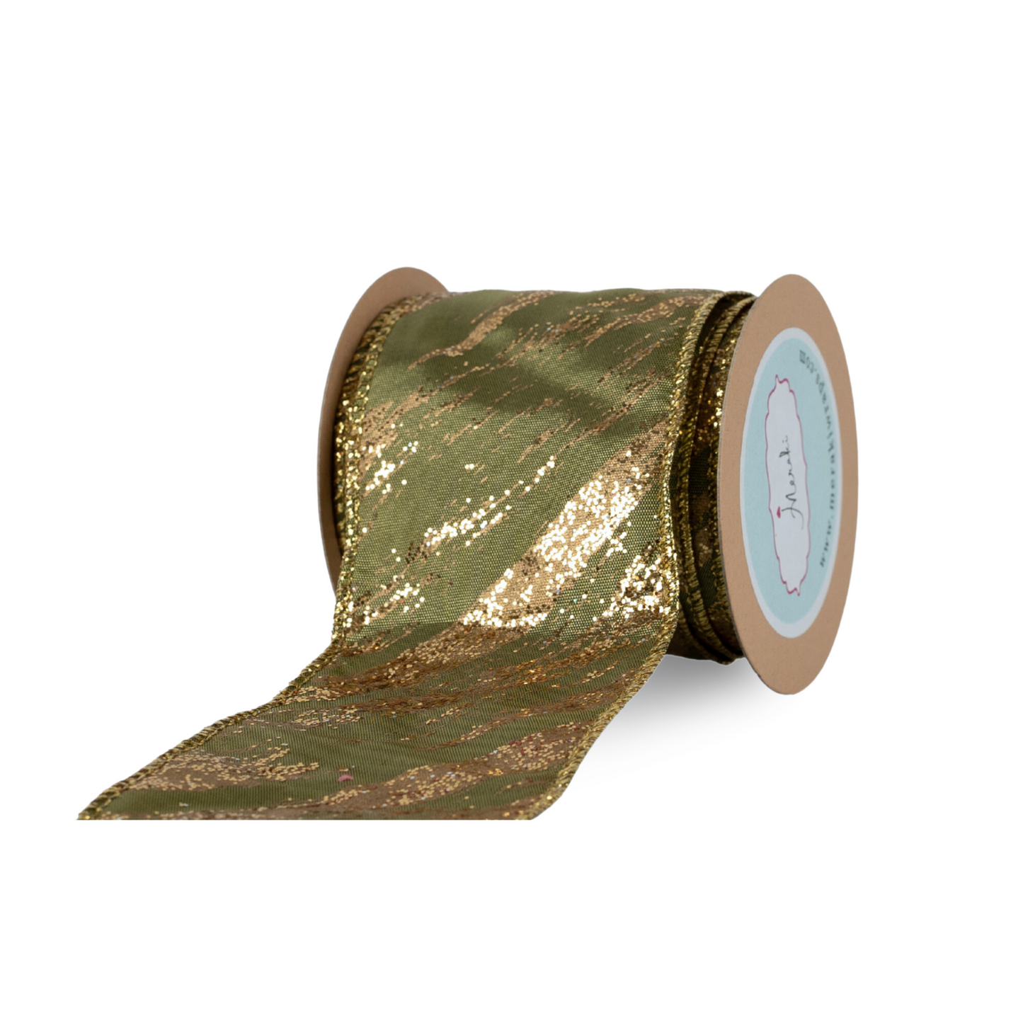 Glittering diagonal streaks of gold and bronze on a rich olive background. Perfect for adding a luxurious touch to gift wrapping, holiday décor, and special event embellishments, this ribbon brings a bold and elegant accent.