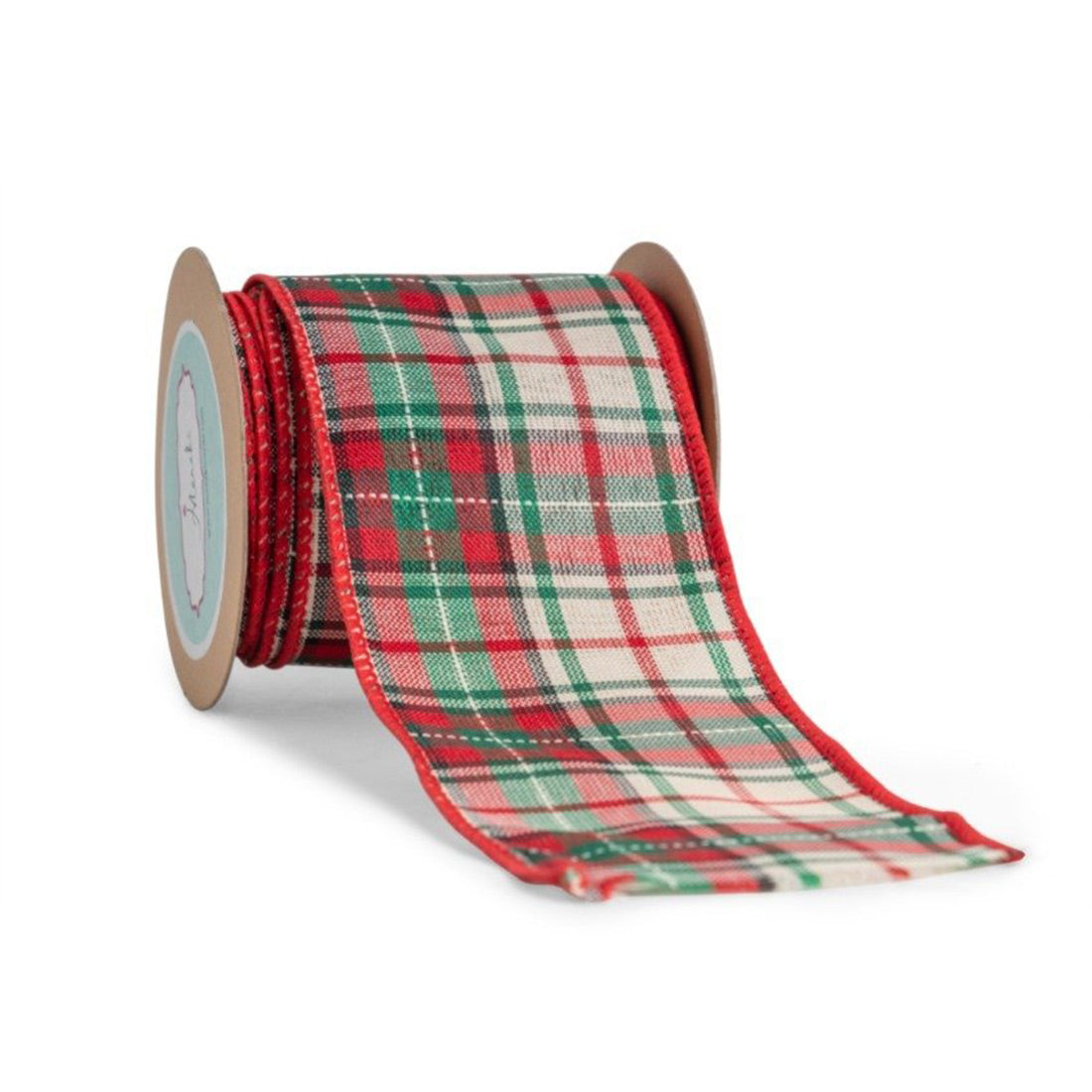 Classic tartan plaid pattern in red, green, and cream, accented with fine stitch details along the edges. The timeless design evokes a cozy, rustic feel, making it perfect for traditional Christmas gift wrapping, wreath embellishments, and festive décor projects. Its warm colors and plaid design are ideal for adding a nostalgic touch to holiday decorations and craft creations.