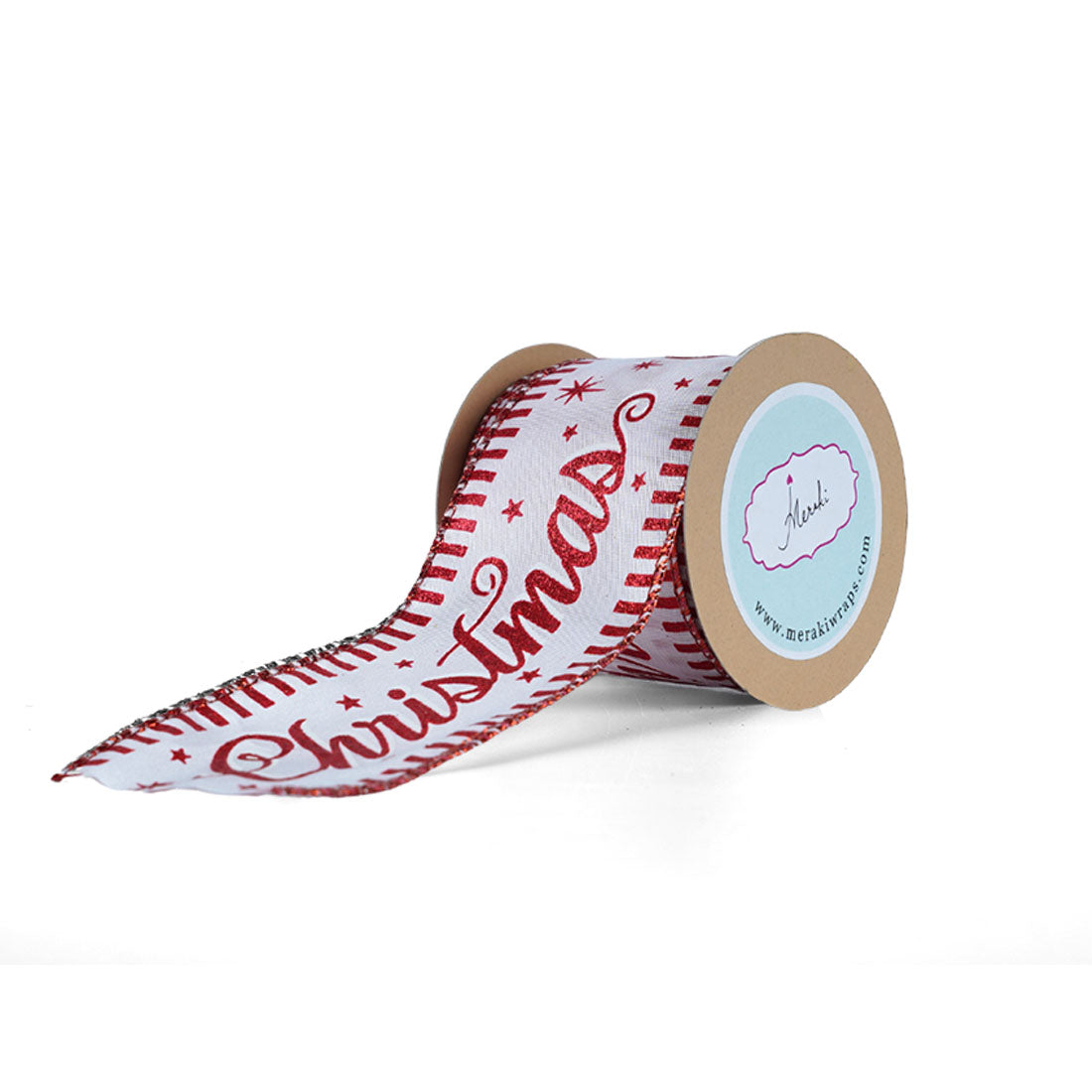 Tie off your presents with a bow of festive cheer! Our white taffeta ribbon features a fun candy stripe border and a 'Merry Christmas' greeting to spread the holiday love. Just the thing to give your decor some jolliness and get your giftee in the Yuletide spirit!