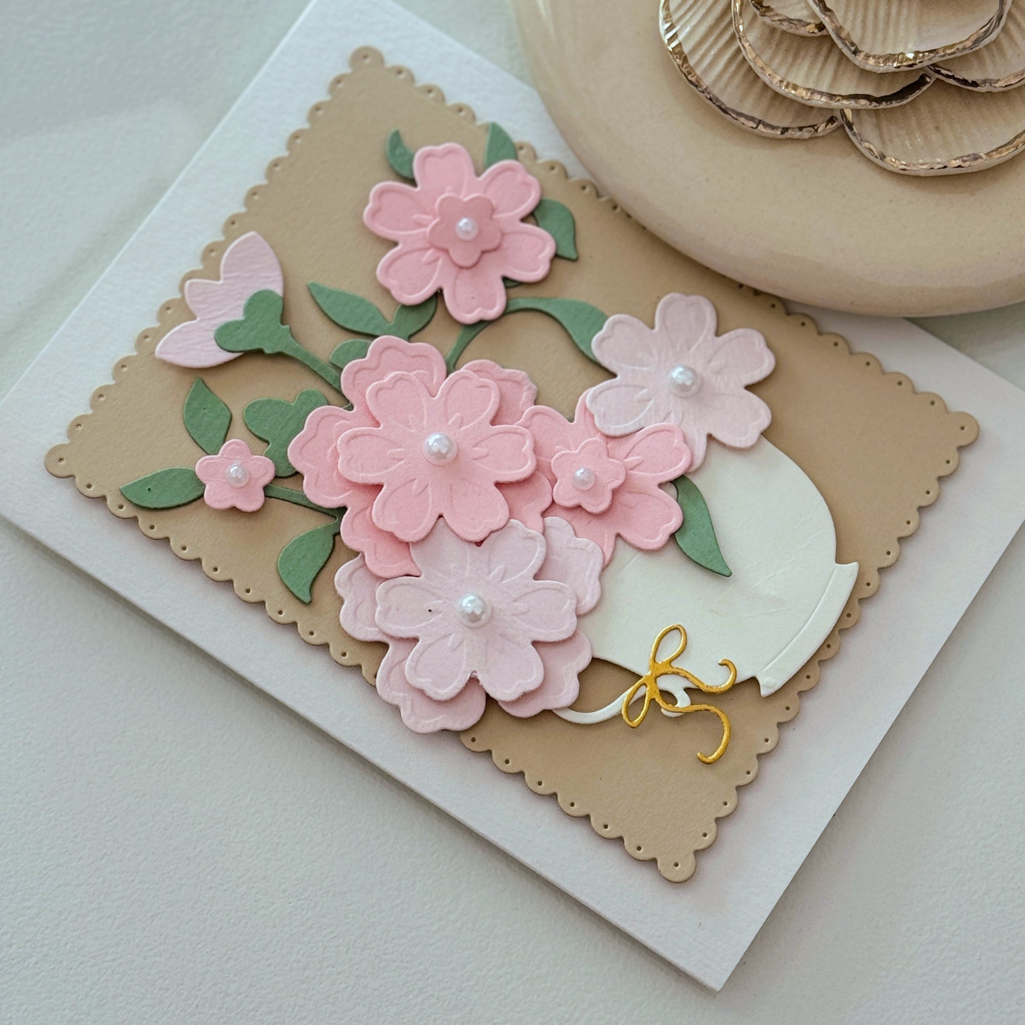Material: Textured cardstock with layered floral cutouts.