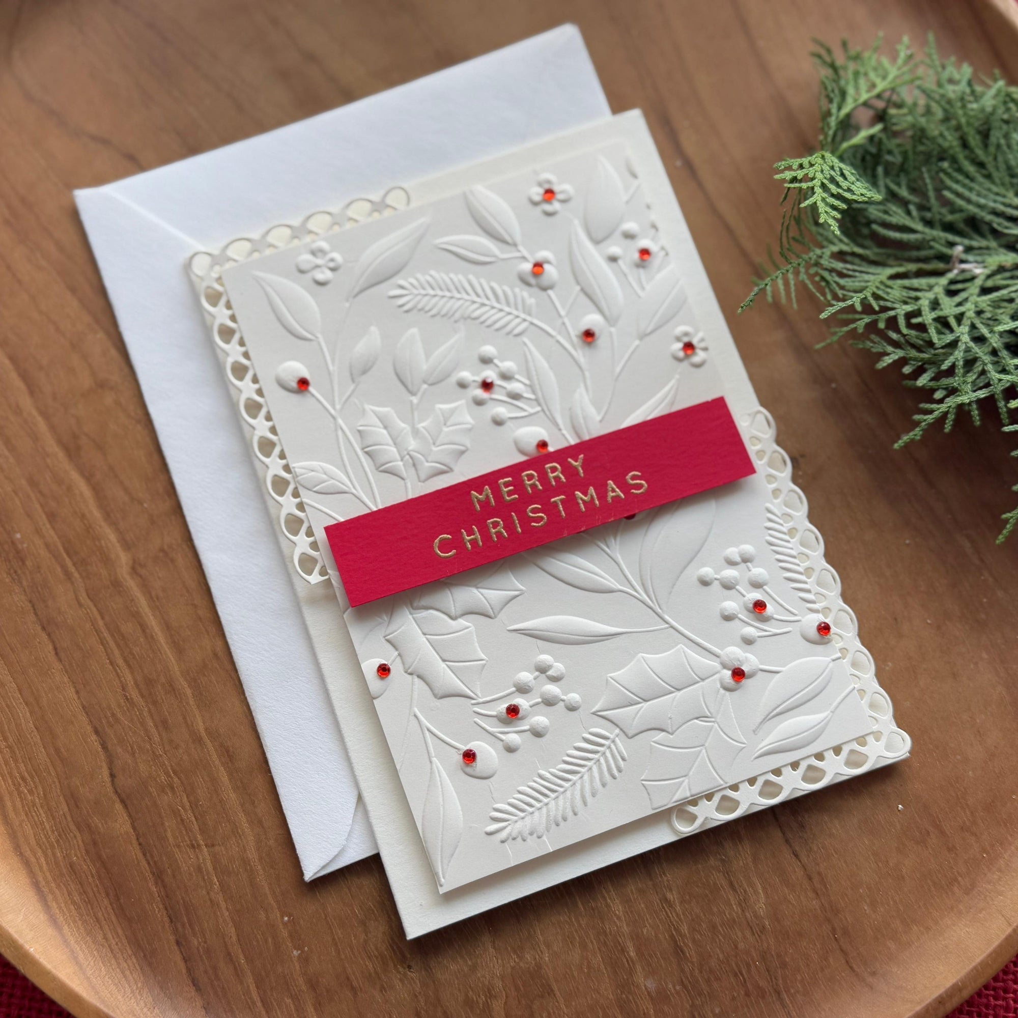 Celebrate the festive season with this elegant ivory greeting card, beautifully designed to bring holiday cheer. Featuring intricate embossed foliage, delicate cutout edges, and sparkling red accents, this card exudes timeless charm. The bold red banner with "Merry Christmas" in gold foil adds a sophisticated touch, making it perfect for sharing your warm wishes with loved ones, friends, or colleagues. A true keepsake for the season.