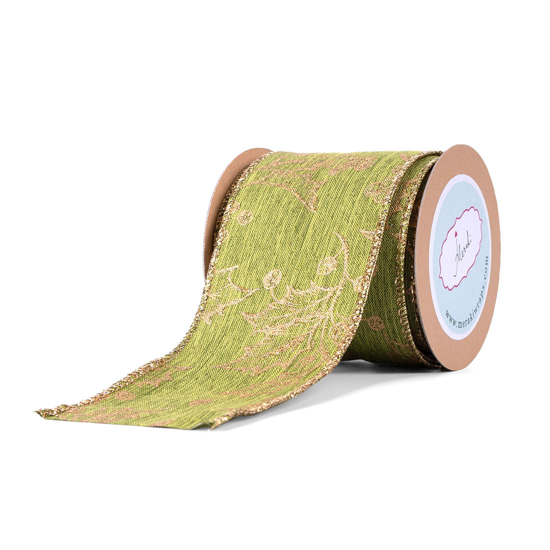 Green wired ribbon with gold scattered holly print