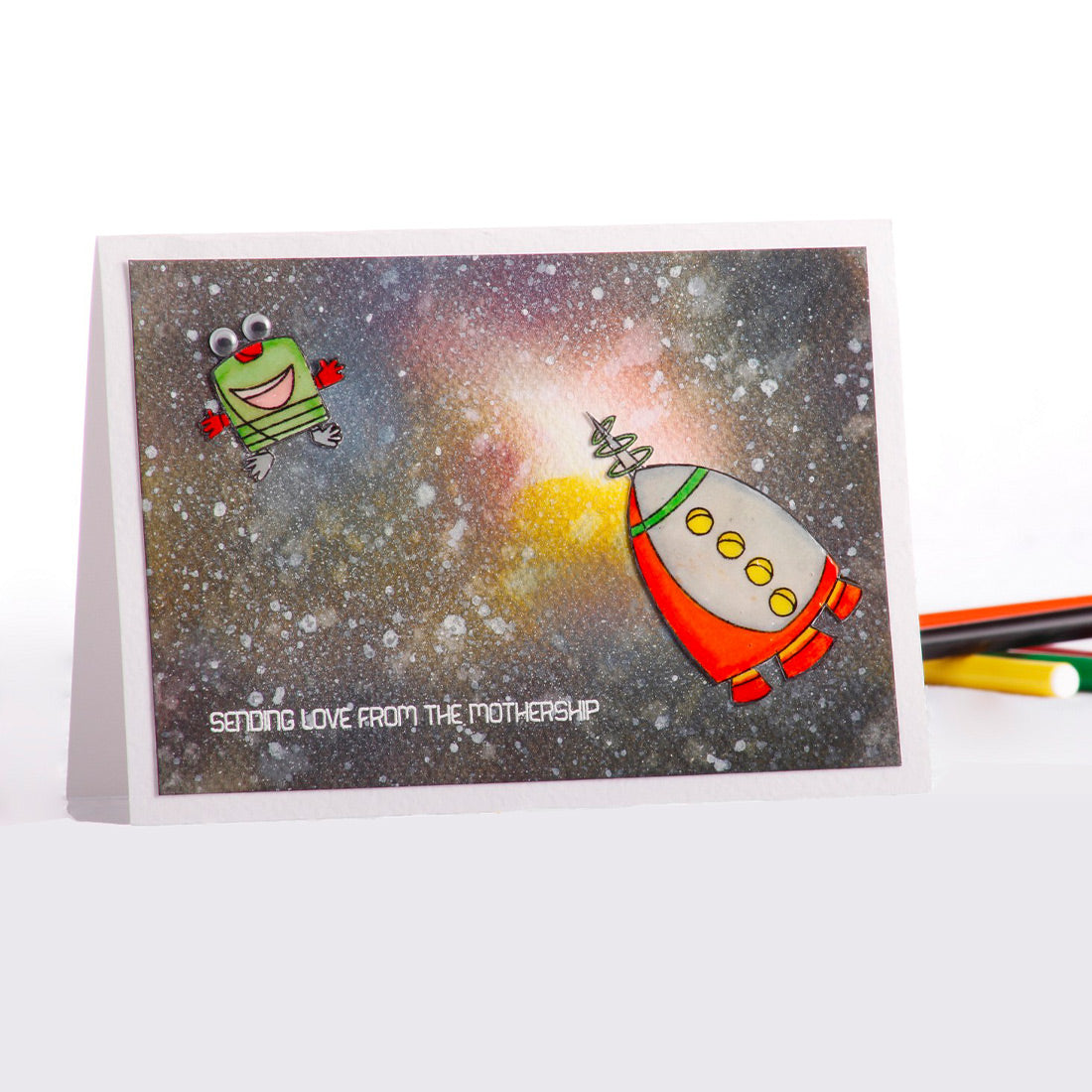 Say 'beep boop bloop' with love this season with this handmade greeting card from the Mothership! This one-of-a-kind space-themed card features a watercolor background, complete with a friendly alien and spaceships. Let your little one know they're truly out of this world with 'love from the Mothership!'