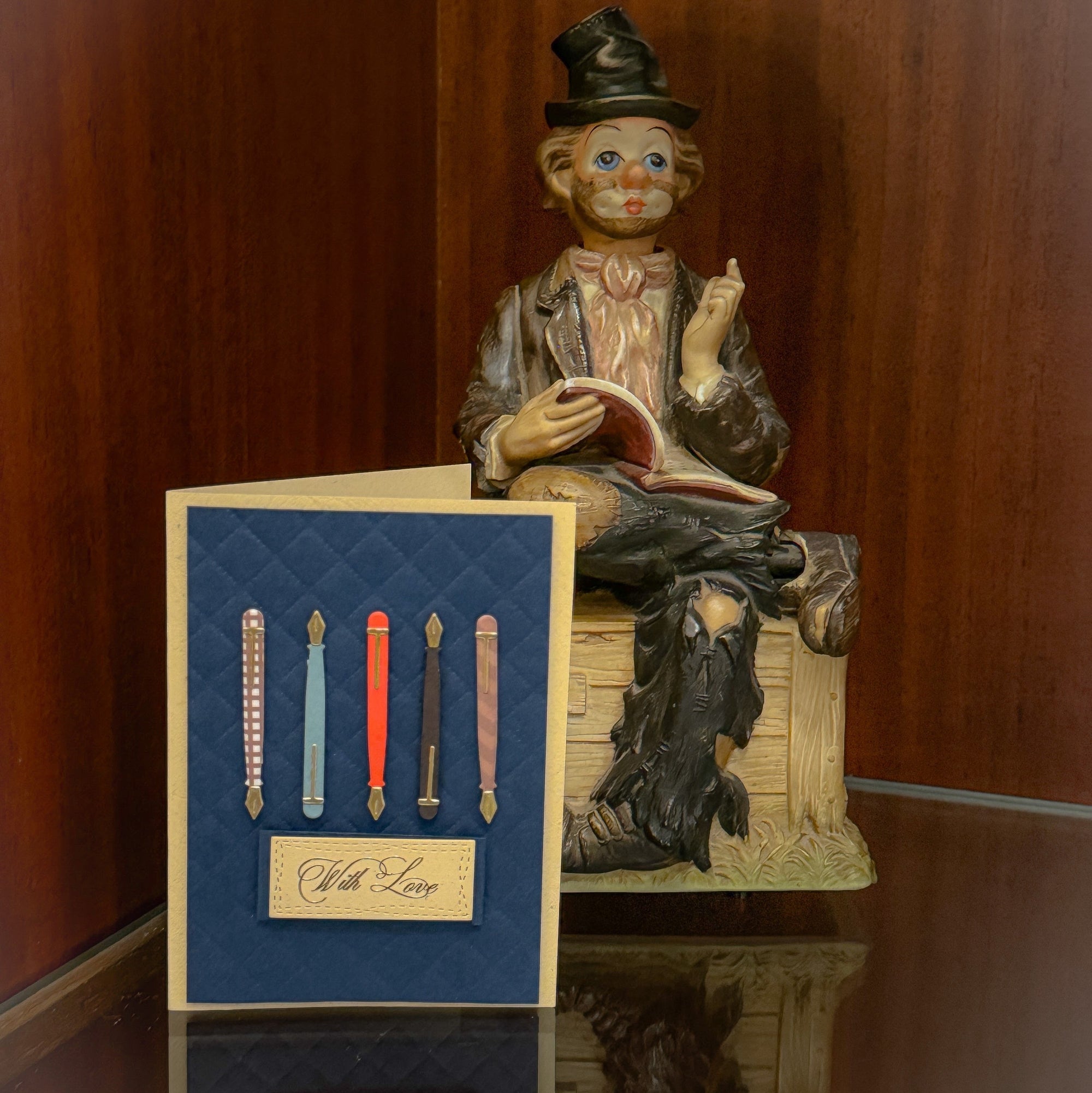 Description: For the pen enthusiast, this card showcases a row of colorful pens with a quilted background. Ideal for a thoughtful note.